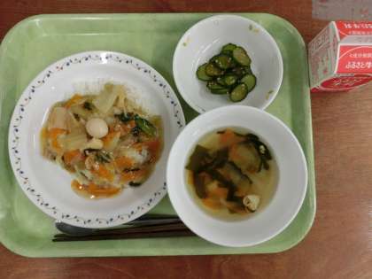 献立は「中華丼、わかめスープ、きゅうりの中華味、牛乳」です。