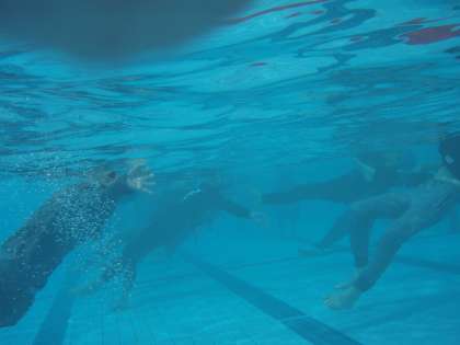 6年生がプールで着衣泳を行いました。水慣れをした後、用意してきた洋服を着て水に入りました。体が重くなり、思ったように自由に動けません。ペットボトルなどを使って、上を向いて浮かぶ練習をしました。