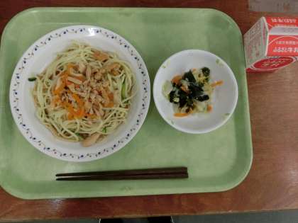 献立は「冷やし中華、わかめサラダ、牛乳」です。