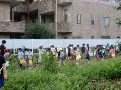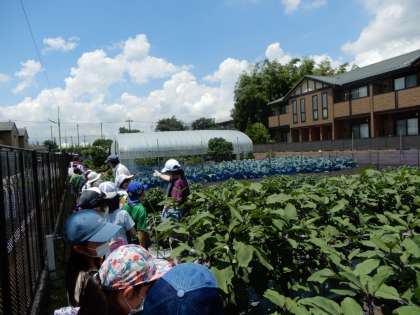 3年生が近くの畑を見学しました。以前、お話を伺った石川さんの畑です。トマト、さといも、インゲンなどがなっている様子を見て回りました。道路を挟んだ反対側の植松農園さんの畑にも入らせていただき、たわわに実った作物を見ました。暑さに負けずに、みんなよくがんばりました。