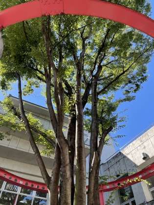 シンボルツリーのけやきの葉の緑や、木を囲むオブジェの赤との対比が一段と鮮やかです。