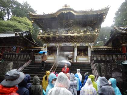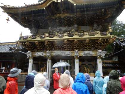 陽明門をじっくり見学しました。雨ガッパでクラス記念写真も撮りました。