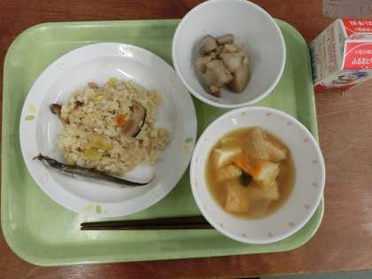 献立は「秋の香りごはん、焼きししゃも、里芋のそぼろ煮、みそ汁、牛乳」です。