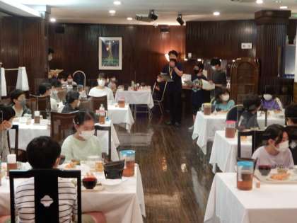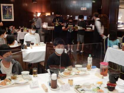 夕食。2回に分かれていただきました。美味しい料理を、みんなよく食べていました。
