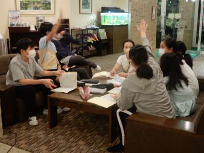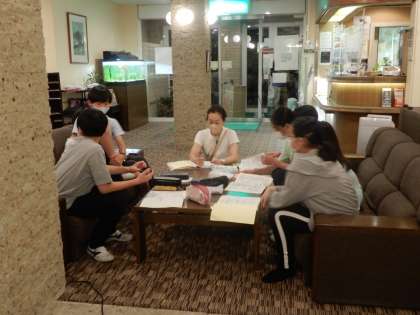 班長会議。今日1日の振り返りをしています。雨の1日でしたが、みんなよくがんばりました。きっと明日はいい天気になるでしょう。今日の通信はおしまいです。おやすみなさい。