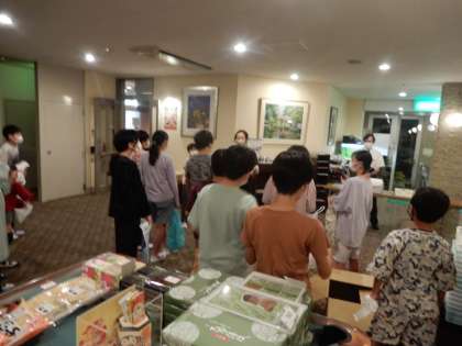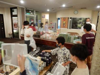 ホテルに着いて入浴の後は、グループに分かれての行動です。おみやげを購入するグループでは、2千円ピタリ賞が2人出ました。すごい。