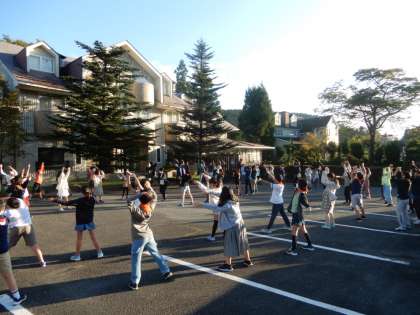朝の会。みんな元気です。運動会の表現運動をしました。よい天気ですが少し肌寒いです。最終日、楽しみましょう。