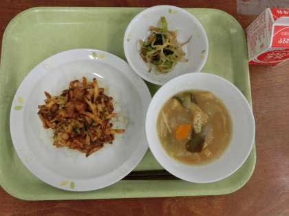 献立は「かきあげ丼、みそ汁、おひたし、牛乳」です。