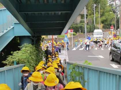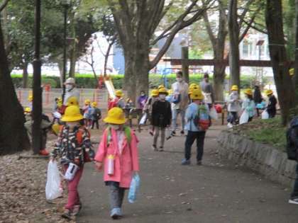 この日のねらいは、(1)秋を見つける事、(2)集団行動で安全に道路を移動したり公園遊びをしたりする事です。