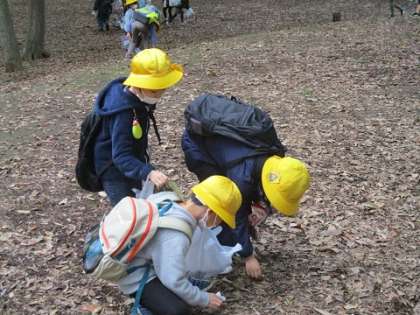色付いた落ち葉や、木の葉の面白い形に気付いたり、色々な形のどんぐりを「見つけた!」と、声を上げる姿が見られました。