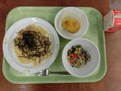 献立は「和風スパゲッティ、大根とひじきのサラダ、スイートポテト、牛乳」です。