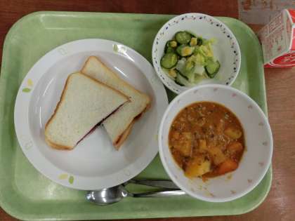 献立は「ジャムサンド、ハンガリアンシチュー、白菜とコーンのサラダ、牛乳」です。