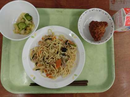 献立は「塩焼きそば、野菜の中華かけ、サーターアンダーギー、牛乳」です。