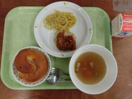献立は「ぶどうパン、ヘルシーハンバーグ、スパゲッティカレーソテー、コンソメスープ、牛乳」です。