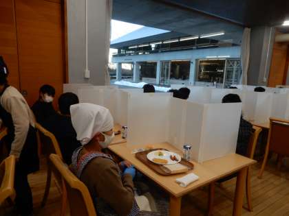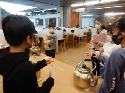 朝食の時間です。食事係が手際よく準備をしました。おかわりのじゃんけんにも、気合いが入ります。みんなよく食べて、モリモリ元気です。