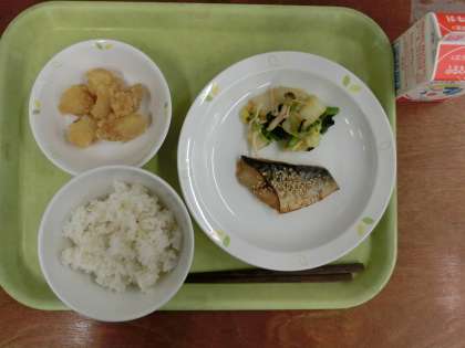 献立は「麦ごはん、魚の七味焼き、きのこ入りおひたし、じゃがいもの甘辛煮、牛乳」です。