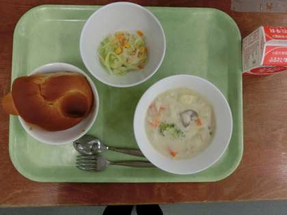 献立は「黒砂糖パン、クリームシチュー、コーンサラダ、牛乳」です。