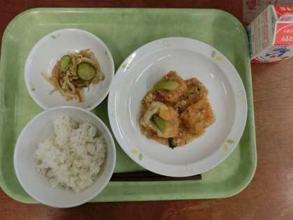 献立は「麦ごはん、生揚げそぼろ、ごま酢かけ、牛乳」です。