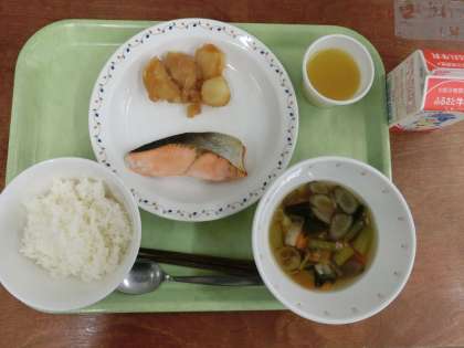 献立は「ごはん、魚の塩焼き、じゃがいもの甘辛煮、根菜汁、みかんゼリー、牛乳」です。