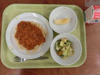 献立は「スパゲッティミートソース、ポテト入りフレンチサラダ、りんご、牛乳」です。