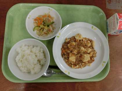 献立は「ごはん、麻婆豆腐、白菜の中華サラダ、牛乳」です。