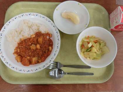献立は「チリビーンズライス、野菜のイタリアンドレッシングかけ、りんご、牛乳」です。