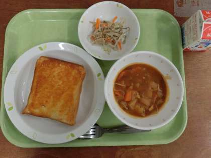 献立は「ガーリックトースト、ビーンズシチュー、もやしとツナのサラダ、牛乳」です。