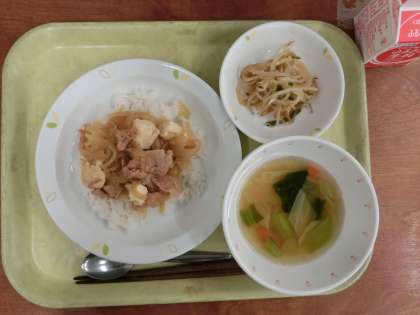 献立は「豚丼、もやしときゅうりの塩ナムル、野菜スープ、牛乳」です。