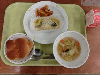 献立は「黒砂糖パン、魚のガーリック焼き、マカロニソテー、白菜のスープ、牛乳」です。