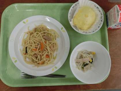 献立は「キャベツとツナのスパゲッティ、青菜のサラダ、チーズ入り蒸しパン、牛乳」です。