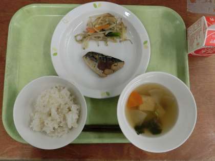 献立は「麦ごはん、さばのみそ煮、おひたし、根菜汁、牛乳」です。
