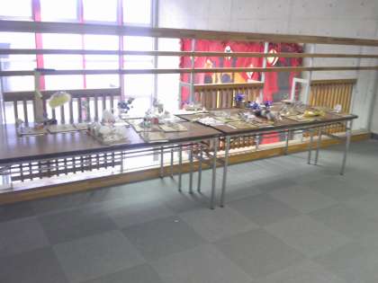 2階職員室前廊下には、図工の作品が並べられています。