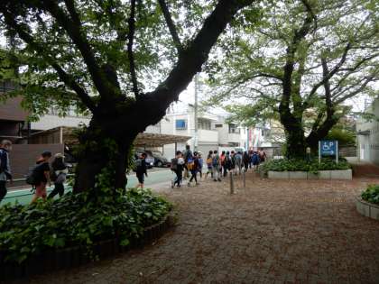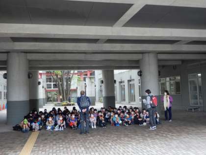 4年生が遠足に出かけます。学年朝会を行なってから、出発しました。みんな元気です。天気がもってほしいです。