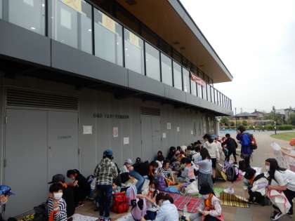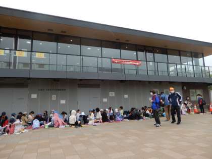 お弁当タイム。少し小雨が降ってきました。建物の庇の下をお借りして、お弁当をいただきました。