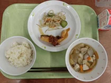 献立は「ごはん、魚のかわりソースかけ、けんちん汁、ごま酢かけ、牛乳」です。