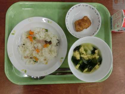 献立は「三色ピラフ、鶏肉のカレー焼き、卵と野菜のスープ、牛乳」です。