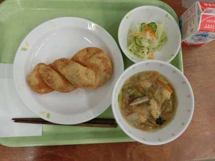献立は「きな粉揚げパン、肉だんご入り春雨スープ、野菜のドレッシングかけ、牛乳」です。