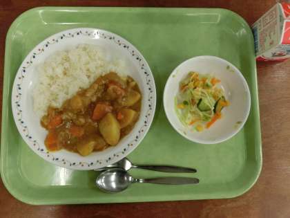 献立は「チキンカレーライス、コーンサラダ、牛乳」です。