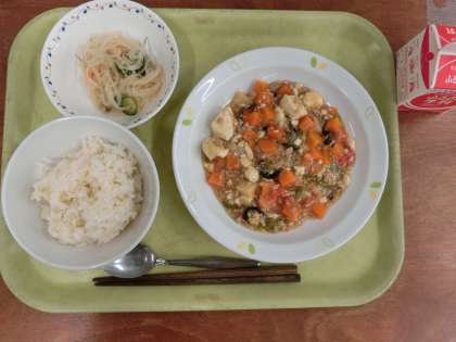 献立は「ごはん、西湖豆腐、春雨サラダ、牛乳」です。