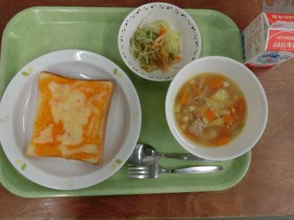 献立は「チーズトースト、白いんげんの田舎風スープ、野菜のカレードレッシング、牛乳」です。