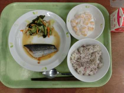 献立は「ゆかりごはん、魚のしょうが風味焼き、春野菜とわかめのサラダ、ピーチヨーグルト、牛乳」です。