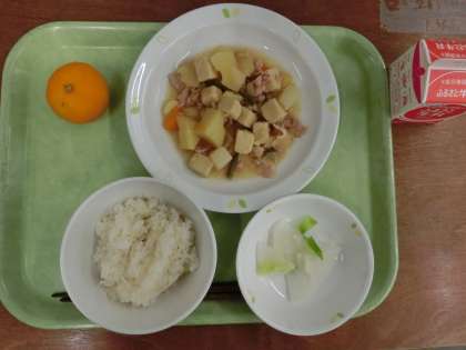 献立は「ごはん、肉じゃがうま煮、大根とキャベツの甘酢かけ、冷凍みかん、牛乳」です。