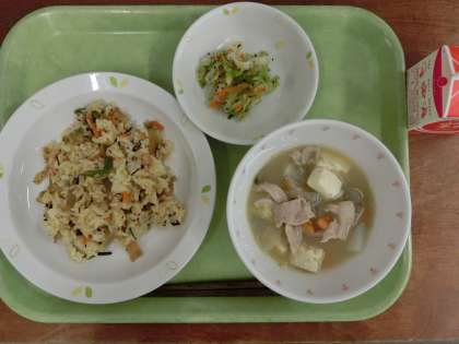 献立は「五目ごはん、キャベツとにんじんのゆかりかけ、豚汁、牛乳」です。