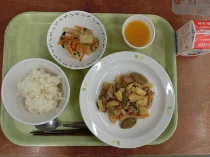 献立は「ごはん、きんぴら煮、青菜と揚げの煮びたし、キャロットゼリー、牛乳」です。