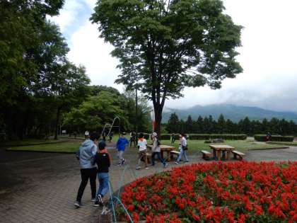 赤城高原SAで2回目のトイレ休憩。霧が立ち込めています。みんな元気です。