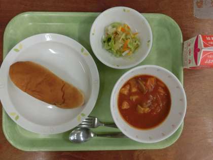 献立は「ぶどうパン、トマトシチュー、コーンサラダ、牛乳」です。