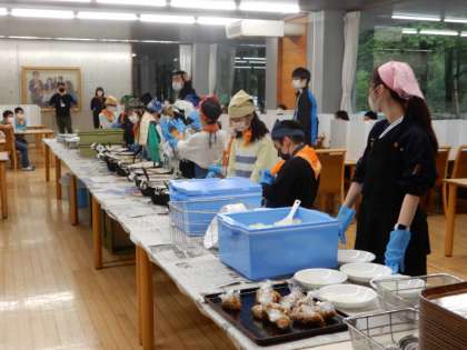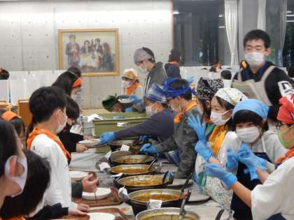 夕食の準備。食事係がスタンバイしています。カレーの出来栄えはさていかに。班によって水分量がだいぶ違いますが?