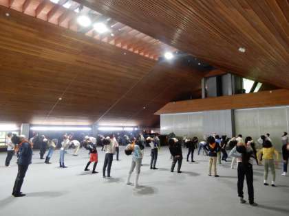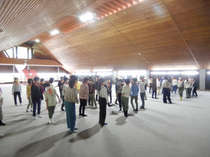 小雨が降ってきたので、残念ながら朝会は村の会堂で行いました。みんな元気です。ラジオ体操をして、体もめざめました。