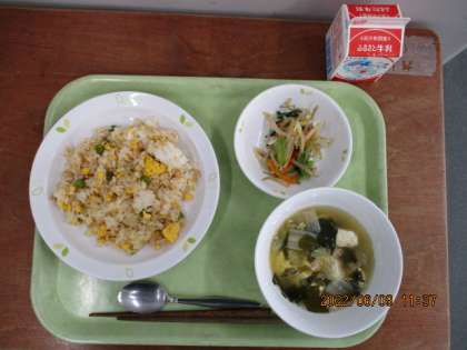 献立は「そぼろ丼、野菜のごまだれかけ、豆腐汁、牛乳」です。