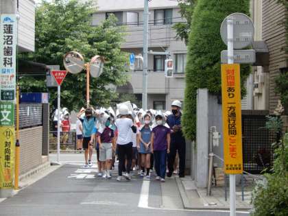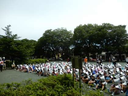 今日の避難訓練は、地震が来た後に出火したという想定で行いました。校庭に一次避難した後、消火活動があるため将軍池公園へ、2次避難しました。500人全員が、安全に避難行動をすることができました。